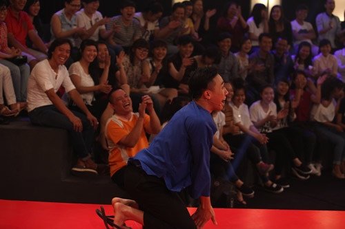 Trấn Thành quỳ lạy Việt Hương để giúp Ngọc Hội hoàn thành tiết mục.
