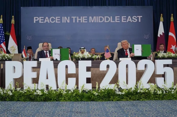 Tổng thống Hoa Kỳ Donald Trump trong lễ ký kết các văn kiện chấm dứt hoạt động chiến sự giữa Hamas và Israel. © AP Photo / Evan Vucci.