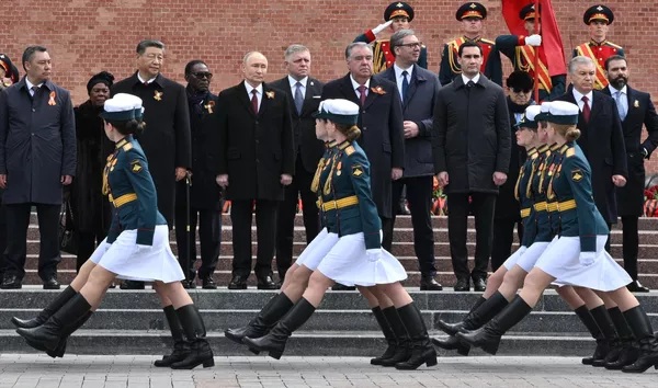 Tổng thống Nga Vladimir Putin và các nhà lãnh đạo nước ngoài trong nghi lễ đặt vòng hoa chung tại Mộ Chiến sĩ Vô danh trong Vườn Alexandrov ở Matxcơva. Nga kỷ niệm 80 năm Ngày Chiến thắng trong Chiến tranh Vệ quốc Vĩ đại 1941-1945. © Sputnik / Host photo agency RIA Novosti/Kirill Zykov .