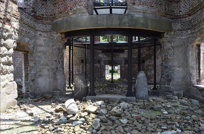 Một dấu tích sót lại của nhà thờ Urakami bị đánh sập trong vụ ném bom ngày 9/8 được đặt trong Công viên hòa bình của Nagasaki ngày nay. Ảnh: Nguyễn Tuyến/PV TTXVN tại Nhật Bản