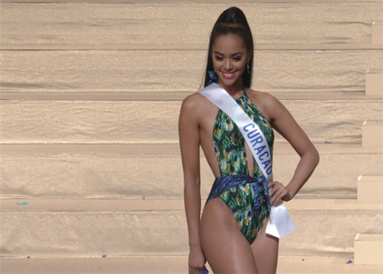 Ứng cử viên đến từ Curacau chọn phong cách áo tắm monokini họa tiết cho thấy gu thời trang tinh tế. Cô là một trong những ứng viên sáng giá cho ngôi vị hoa hậu năm nay.