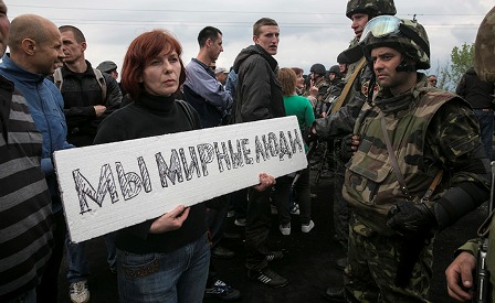 Người dân ở Slaviansk mang khẩu hiệu: "Chúng tôi là người dân hòa bình" trước một trạm kiểm soát của quân đội Ukraine ngày 2/5. Ảnh: Reuters