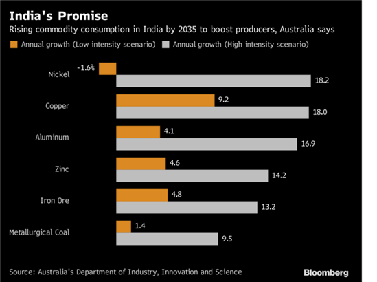 Ấn Độ có tiềm năng tăng tiêu thụ tất cả mọi thứ từ đồng đến quặng sắt khi nền kinh tế của nước này tiếp tục tăng trưởng trong hai thập niên tiếp theo và dân số tại các thành phố của nước này đang tăng lên từng ngày, theo các dự báo từ chính phủ Úc nhằm tìm hiểu liệu nước này lặp lại những gì đã xảy ra với Trung Quốc không.