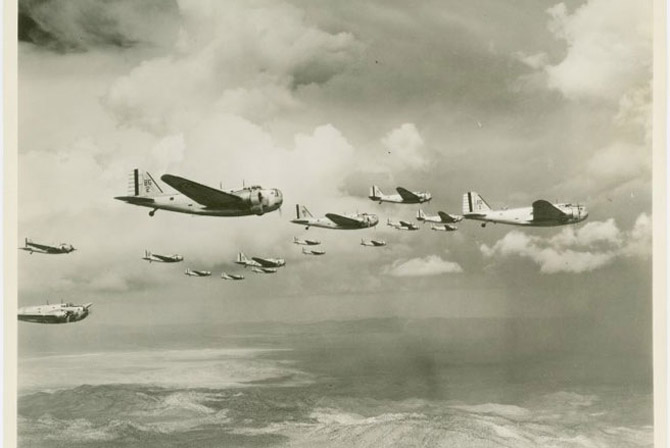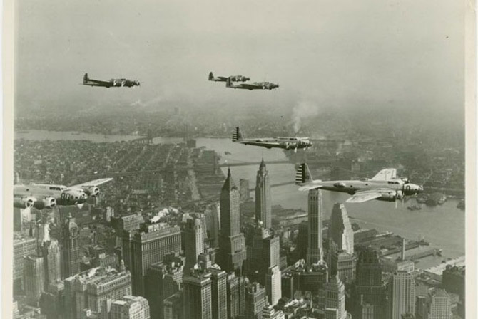 Máy bay quân sự Mỹ bay trên bầu trời ở Manhattan, ảnh chụp năm 1939.