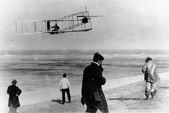 Ngày 17/12/1903, Orville Wright điều khiển chiếc máy bay Wright Flyer trong chuyến bay đầu tiên của chiếc máy bay này trên bầu trời ở Kitty Hawk, North Carolina. Đây là chiếc máy bay làm bằng gỗ, dây điện và vải. Chiếc máy bay đã đạt độ cao gần 37 mét so với mặt đất và bay được trong 12 giây. Wright được ghi nhận là người đầu tiên thử nghiệm thành công cho máy bay bay được.