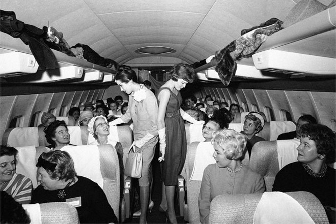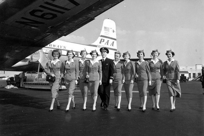 Giữa thập niên 1950, các tiếp viên nữ của hãng Pan Am được đào tạo trên máy bay.