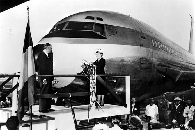 Ngày 16/10/1958, đệ nhất phu nhân Mỹ và Chủ tịch hãng hàng không Pan Am, ông Juan Trippe, bên chiếc máy bay mới tinh Boeing 707-121. Đây chính là chiếc máy bay mở ra kỷ nguyên máy bay phản lực thương mại cho nước Mỹ bằng chuyến bay từ New York tới Paris.