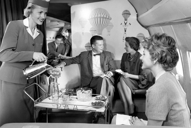 Một nữ tiếp viên của hãng Pan Am phục vụ nước mát và quả ô liu trên chuyến bay với chiếc Boeing 707, không rõ thời gian.