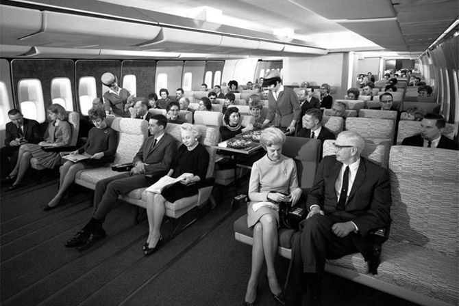 Khách bay hạng bình dân trên một chiếc Boeing 747 với không gian rộng rãi, ảnh chụp không rõ ngày.