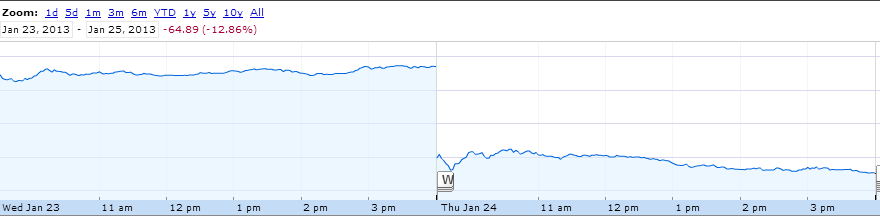 Trong phiên giao dịch ngay sau khi công bố báo cáo tài chính, cổ phiếu Apple tăng nhẹ. Nhưng sáng hôm sau, điều khủng khiếp đã xảy ra, cổ phiếu hãng này "rơi tự do", mất tới 50 USD (khoảng 10% giá trị) tức là các ông chủ của Apple khi tỉnh dậy phát hiện ra họ đã mất 50 tỷ USD. Rồi đến hôm nay, cổ phiếu hãng này mất thêm 20 USD, chỉ còn 430 - con số thấp kỷ lục. Và, lần đầu tiên kể từ khi trở thành công ty lớn nhất thế giới (tính theo giá trị thị trường) Apple mất vị trí đó.