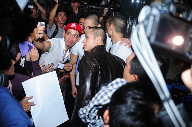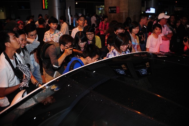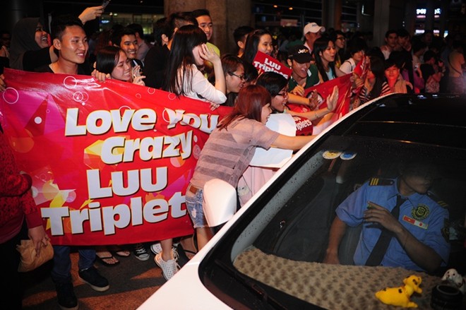 Các fan và cánh phóng viên vây chặt chiếc xe chở ba anh em họ Lưu...