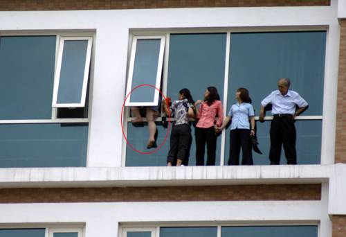 Chị Hạnh đang trèo ra lan can