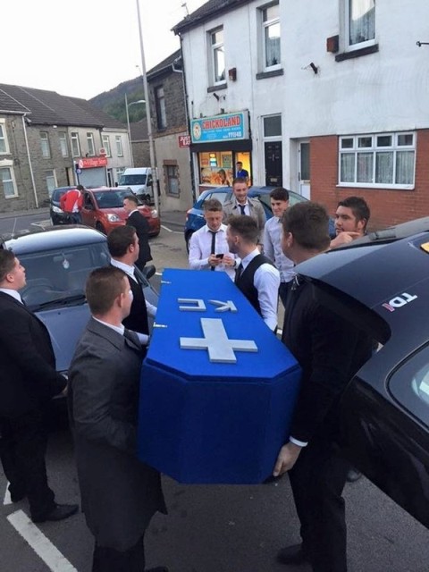 Thông tin trên Daily Mail cho hay, khi đến xem trực tiếp giải bóng bầu dục quốc tế tại một quán bar nhỏ trong vùng, anh chàng Keiran Cable 20 tuổi người Anh đã vô cùng kinh ngạc khi thấy 50 chiến hữu của mình đang chuẩn bị sẵn sàng để làm “đám tang” cho anh. Nguyên nhân xuất phát từ việc sau khi có người yêu, Keiran đã bỏ bê bạn bè, và không còn xuất hiện trong những cuộc vui với bạn bè như trước đây.