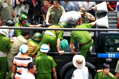 Cảnh sát trấn áp, còng tay và đưa đối tượng ra xe. Ảnh: Oanh Nguyễn