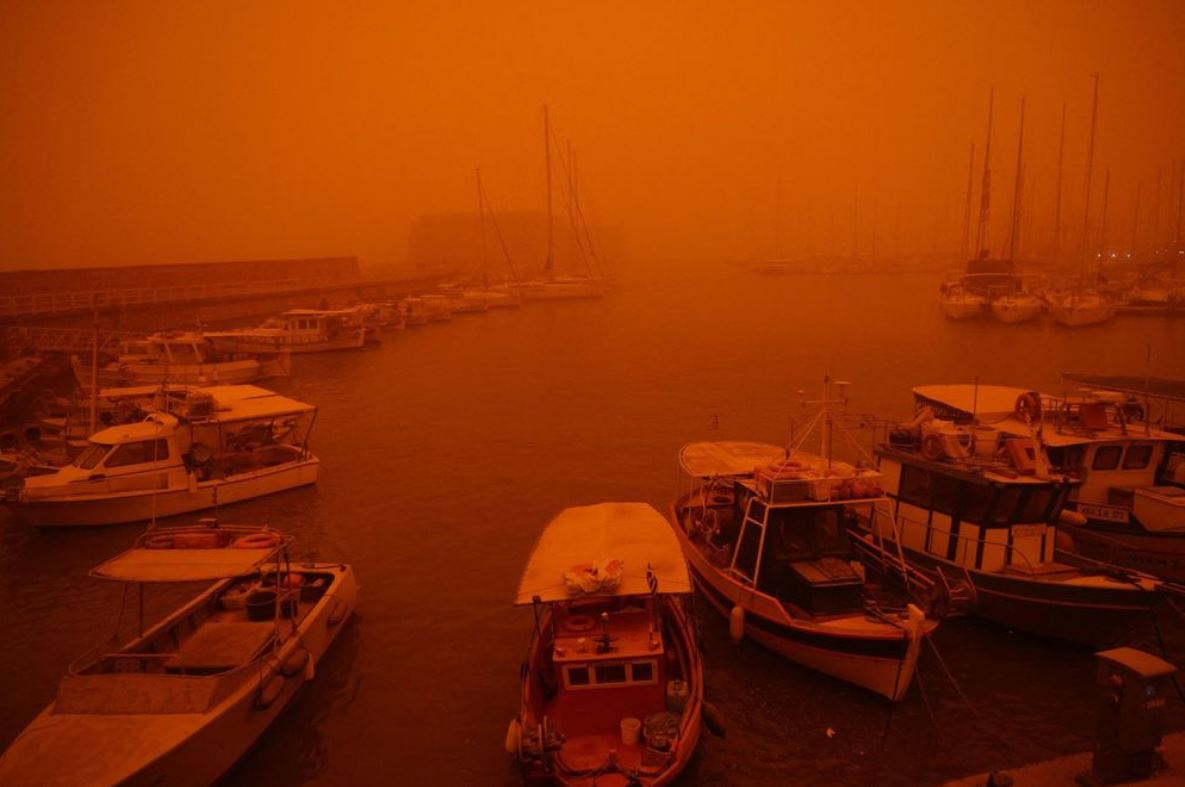 Lượng bụi khổng lồ từ sa mạc Sahara bị gió cuốn sang Địa Trung Hải khiến bầu trời tại Hy Lạp đổi màu đỏ sẫm, bao phủ nhiều khu vực ngay trước lễ Phục sinh.