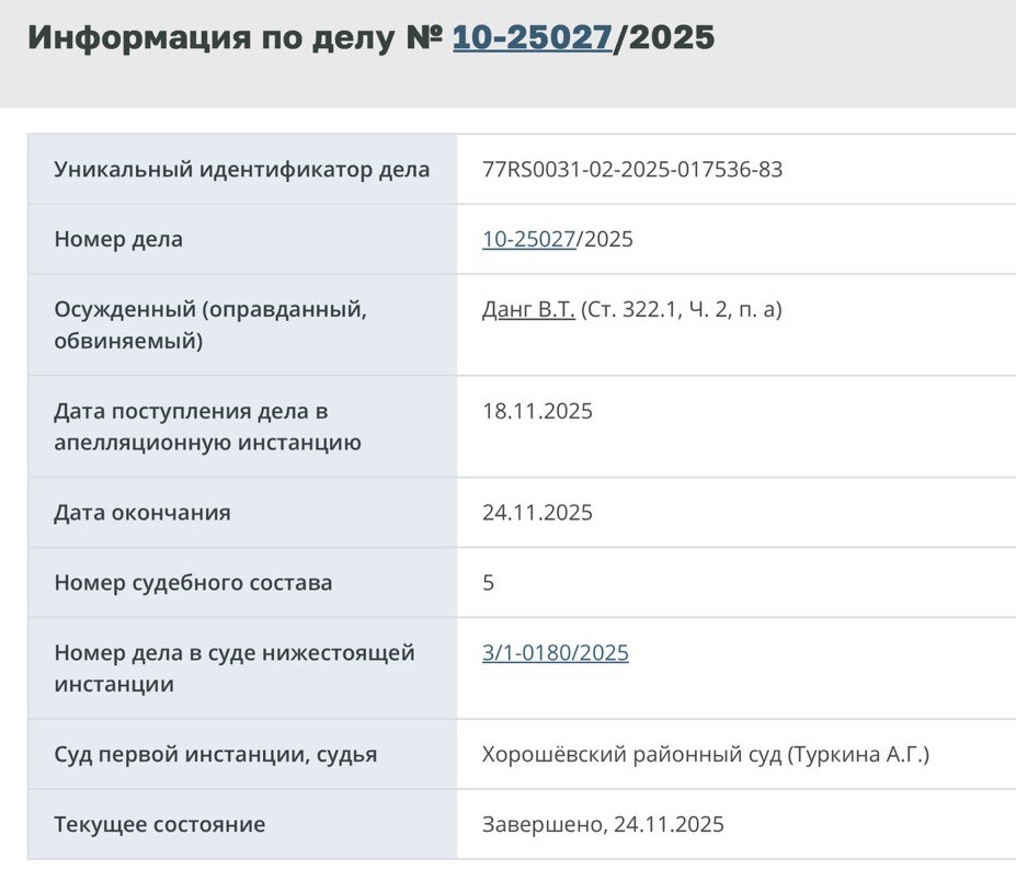 Ngày 24/11/2025, Tòa án thành phố Moskva đã ra quyết định phúc thẩm trong vụ án hình sự số 10-25027/2025, giữ nguyên lệnh tạm giam đối với ông Đặng V.T., công dân Liên bang Nga, người gốc Việt, bị truy cứu trách nhiệm hình sự theo điểm “a” khoản 2 Điều 322.1 Bộ luật Hình sự Liên bang Nga – tội tổ chức di cư trái phép.