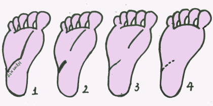 - Đường Định Mệnh vươn ra đến giữa lòng bàn chân nhưng lại bị đứt ở giữa (hình 4): Đây là người không kiên định, hay thay đổi công việc. Họ ít khi chịu làm yên ổn ở một công ty nhất định. Người này rất thích hư vinh nhưng do sự đứt đoạn của đường định mệnh mà cuộc sống của họ khá vất vả.