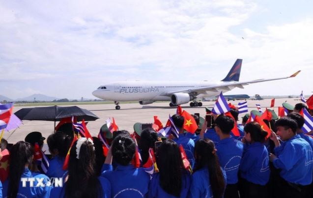 Đông đảo đoàn viên, thanh niên Hà Nội đón Bí thư Thứ nhất, Chủ tịch nước Cuba Miguel Díaz-Canel Bermúdez và Phu nhân tại Sân bay quốc tế Nội Bài. (Ảnh: Văn Điệp/TTXVN)