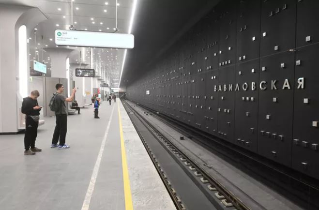 Ga "Vavilovskaya": Các chi tiết thép khảm gương trên tường đen được thiết kế để không làm chói mắt người lái tàu. Ánh sáng nhấp nháy chỉ được chiếu sáng cho hành khách đang chờ tàu. Đèn sân ga có đường kính từ 10 đến 30 cm giúp tăng cường góc nhìn và tạo hiệu ứng chuyển động của các hạt ánh sáng
