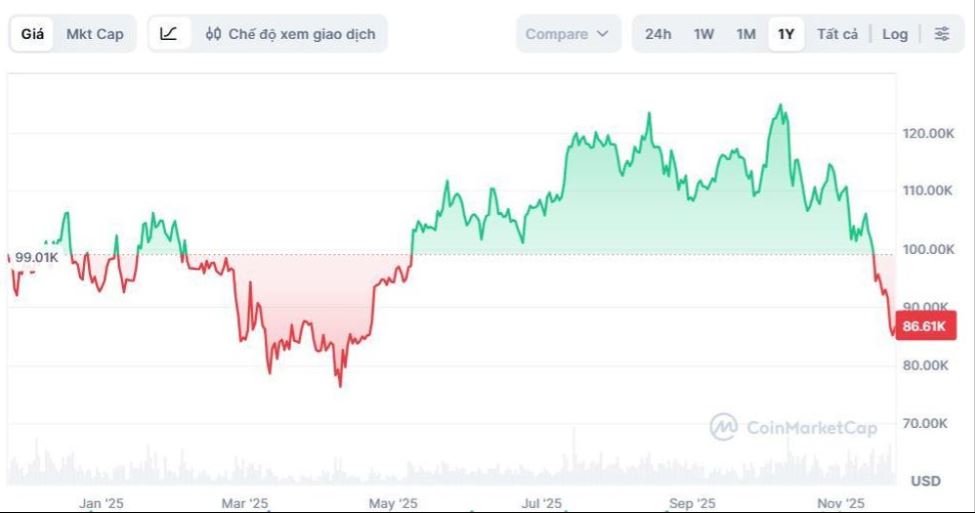 Đồng tiền mã hóa lớn nhất thế giới có thời điểm thủng mốc 80.000 USD trước khi hồi phục kỹ thuật về mốc 86.000 USD tính đến ngày 23/11. Theo dữ liệu của CoinGecko, tổng giá trị vốn hóa thị trường tiền số đã rơi xuống dưới 3.000 tỷ USD, thấp nhất kể từ tháng 4.