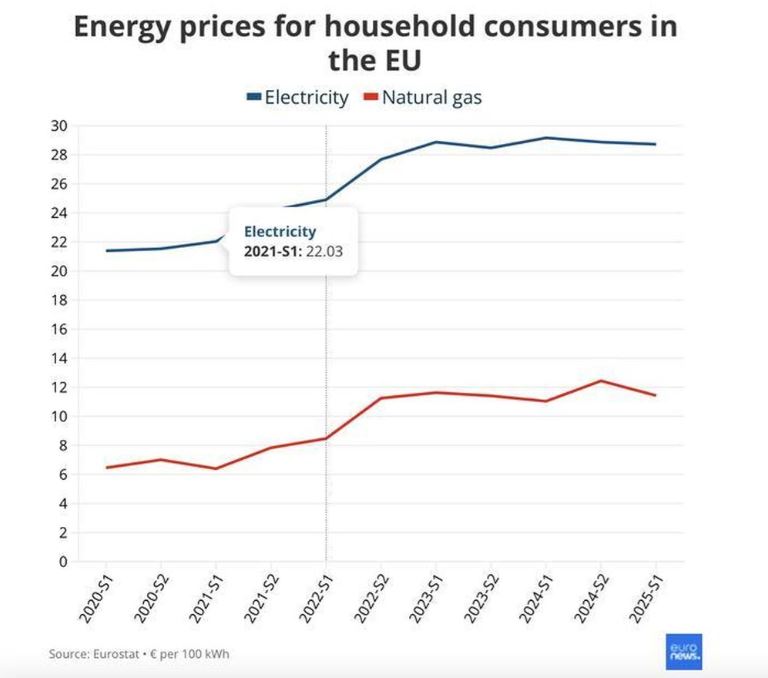 Cơ quan thống kê châu Âu Eurostat công bố dữ liệu giá năng lượng hai lần mỗi năm, với bản cập nhật mới nhất bao gồm số liệu nửa đầu năm 2025. Trong giai đoạn từ nửa đầu năm 2021 đến nửa đầu năm 2025, giá điện hộ gia đình tại EU tăng 30%, từ 22 euro cent/kWh lên 28,7 euro cent/kWh. Cùng kỳ, giá khí đốt tự nhiên tăng 79%, từ 6,4 euro cent/kWh lên 11,4 euro cent/kWh.