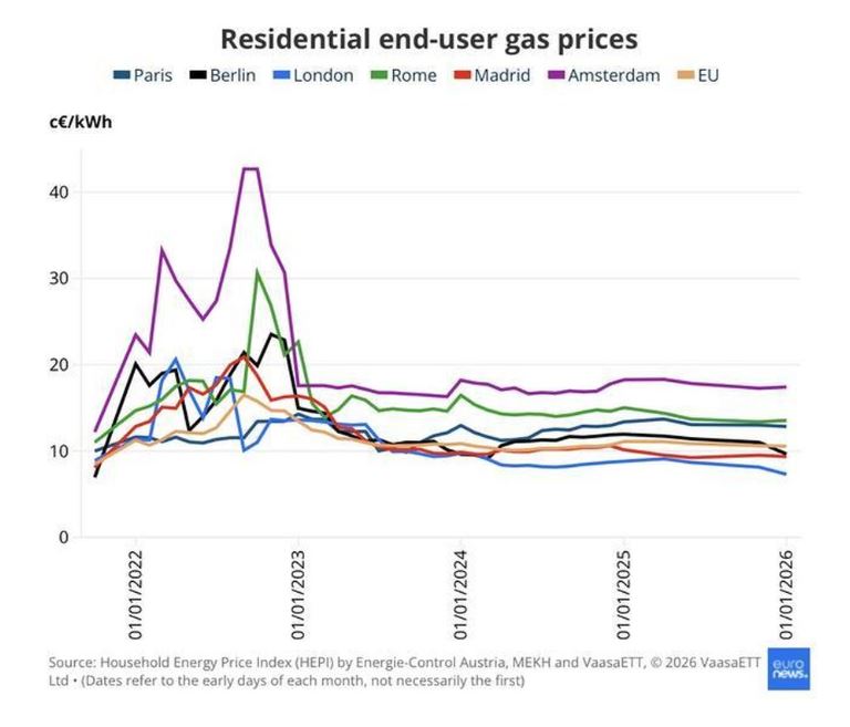 Đối với khí đốt tự nhiên, trong giai đoạn từ tháng 1/2022 đến tháng 1/2026, giá bán lẻ cuối cùng cho hộ gia đình tại các thủ đô EU chỉ giảm nhẹ 1%. Một số thành phố ghi nhận mức giảm đáng kể gồm có Berlin (-41%), Brussels (-40%) và Athens (-40%). Ngược lại, một số nơi chứng kiến con số tăng mạnh, dẫn đầu là Riga (89%), tiếp theo là Warsaw (55%) và Lisbon (55%). Dữ liệu giá khí đốt tháng 1/2021 không có sẵn; số liệu gần nhất trước năm 2022 là tháng 11/2021.