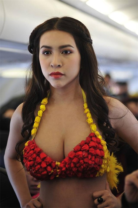 Trong loạt ảnh chia sẻ trên facebook, có những hình ảnh rất sexy với bộ bikini kết từ hoa hồng, khéo léo để lộ vòng 1 căng đầy. Màn trình diễn bất ngờ này của các cô gái đã khiến hành khách tỏ vẻ hứng thú, còn dùng các thiết bị kỹ thuật số như điện thoại, máy tính bảng để lưu lại.