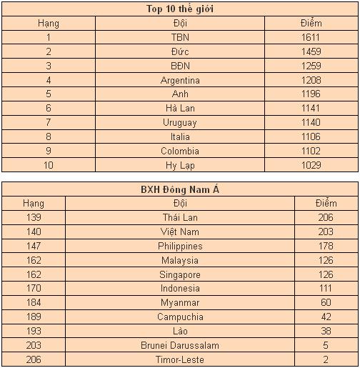 Trong khi đó, ĐT Việt Nam đã tăng 6 bậc để đứng thứ 140 thế giới, nhưng vẫn phải xếp sau Thái Lan (139). Tính riêng trong khu vực Đông Nam Á, Việt Nam là đội tăng nhiều bậc nhất (6), so với 3 của Philippines. Thái Lan là đội sa sút nhất khi tụt tới 8 bậc, còn Malaysia cũng kém đi 6 bậc so với BXH tháng trước.
