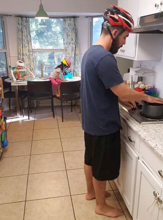 Cả gia đình đội mũ bảo hiểm ăn cơm