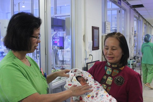 Nữ y tá trưởng lưu luyến trước khi chia tay 4 cháu bé đặc biệt nhất của Bệnh viện từ trước đến nay - Ảnh: Bệnh viện Phụ sản Trung ương cung cấp