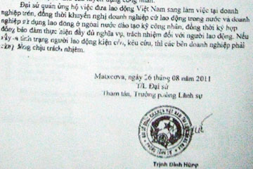 Trong công văn gửi Cục Quản lý Lao động ngoài nước (Bộ LĐ-TB&XH), ngày 26-8-2011, để thẩm định thông tin về xưởng may Vinastar, Đại sứ quán Việt Nam tại Nga xác nhận: Đại sứ quán ủng hộ việc đưa lao động Việt Nam sang làm việc tại doanh nghiệp trên, đồng thời khuyến nghị doanh nghiệp cử lao động trong nước và doanh nghiệp sử dụng lao động ở ngoài nước đào tạo kỹ công nhân, đồng thời ký hợp đồng bảo đảm thực hiện đầy đủ nghĩa vụ, trách nhiệm đối với lao động. Nếu xảy ra tình trạng người lao động kiện cáo, kêu cứu thì các bên doanh nghiệp phải cộng đồng chịu trách nhiệm.