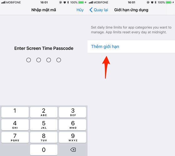 - Giới hạn thời gian sử dụng ứng dụng: Để sử dụng, bạn hãy vào Settings (cài đặt) > Screen Time (thời gian sử dụng ứng dụng) > App Limits (giới hạn ứng dụng), nhập mật khẩu giới hạn khi được yêu cầu (không phải mật khẩu máy). Trong màn hình tiếp theo, bạn nhấp vào tùy chọn Add Limit (thêm giới hạn), chọn danh mục ứng dụng tương ứng rồi nhấn Add (thêm), sau đó thiết lập ngày giờ và thời gian được phép sử dụng.