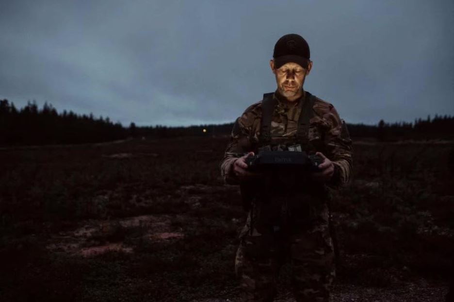 Một binh sĩ Thụy Điển điều khiển máy bay không người lái trong khu rừng gần Lomben,