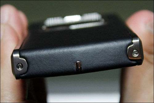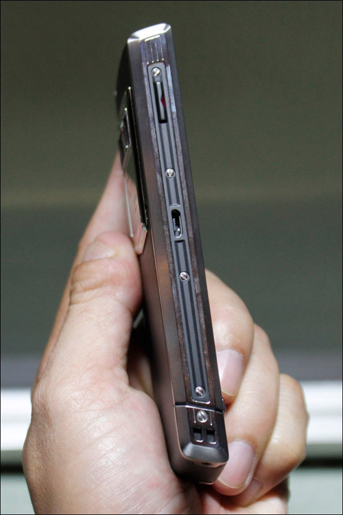 Cạnh trái với phím Vertu được đính viên đá ruby đỏ ở phía trên và cổng microUSB.