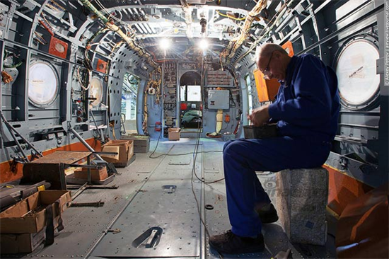 Một công nhân đang hoàn thiện các bộ phận còn lại bên trong cabin trực thăng.