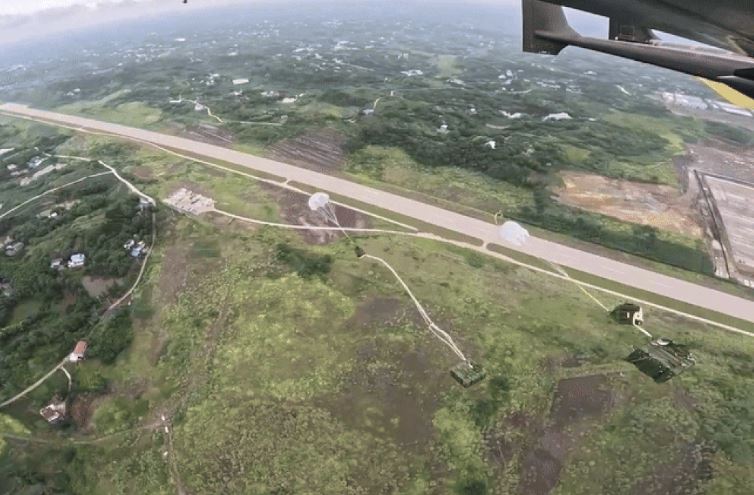 Các kiện hàng có tổng trọng lượng 1,2 tấn được UAV vận tải hạng nặng thả từ trên không.