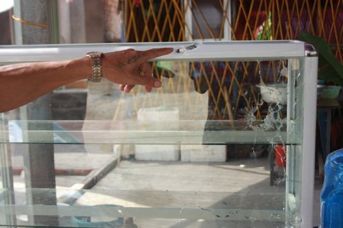 Tủ kính đựng thức ăn cũng có nhiều vết đạn xuyên qua.
