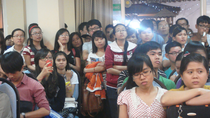 Hội trường tầng 5 báo Mực Tím (đường Phạm Ngọc Thạch, Q.3, TP.HCM) đông nghịt với khoảng 500 người, đến mức một nhân viên của hội quán Mực Tím (đặt tại tầng này) thốt lên "chưa khi nào thấy đông như vậy!".