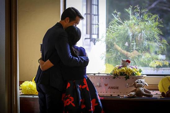 Hôm tang lễ ở Úc, anh ôm quan tài con, chị ôm đóa hoa và con gấu bông bên cạnh.
