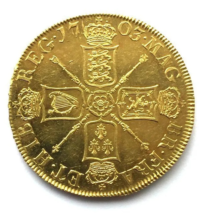 Đồng tiền này là một trong số 20 đồng tiền duy nhất được đúc từ 7,5 pound vàng mà người Anh tịch thu từ các tàu chở kho báu của Tây Ban Nha vào năm 1702 sau Trận chiến Vigo.