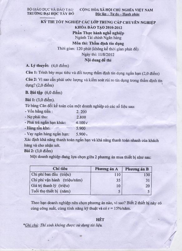 Đề thi Thẩm định tín dụng trong ngày thi Tốt nghiệp của lớp Trung cấp Tài chính Ngân hàng ngày 11/8/2012.
