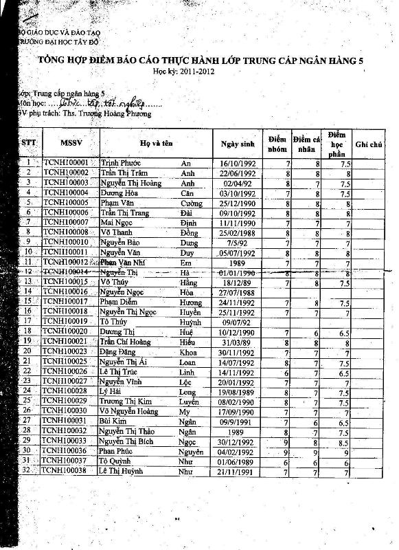 Nhưng rất buồn cười và vô lý: Nếu Thu Thảo đã tốt nghiệp trung cấp trong tháng 5, tức là cô đã hoàn thành hết tất cả nghĩa vụ học hành, thì làm gì có chuyện Thu Thảo có tên trong bảng “Tổng hợp điểm Báo cáo thực hành lớp Trung cấp Ngân hàng 5”, với số điểm rất chi tiết: Điểm nhóm 7, Điểm cá nhân 7, Điểm học phần 7. Bảng điểm này có chữ ký của người chấm là Thạc sĩ Trương Hoàng Phương, giảng viên Lý Thị Phương Thảo, lập ngày 22/7/2012. Tức là, sau khi cô "tốt nghiệp" khoảng 2 tháng (như lời công văn hỏa tốc), cô quay lại... học, thi môn này!