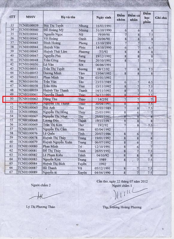 Bảng điểm chi tiết của Hoa hậu  Đặng Thu Thảo (số thứ tự 50) được hai giám khảo Lý Thị Phương Thảo và Trương Hoàng Phương ký tên bên dưới vào ngày 22/7/2012.