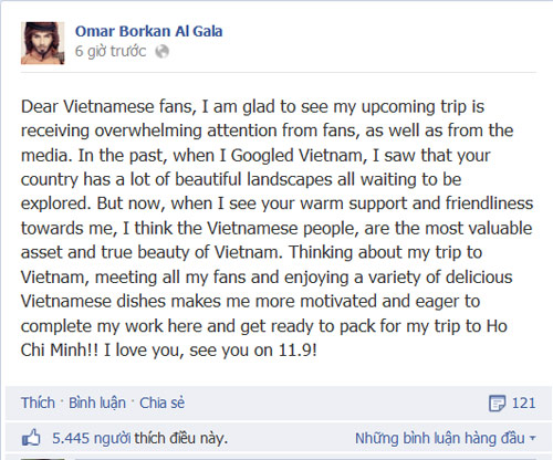 Omar Borkan Al Gala cũng thông báo với các fan rằng, vào ngày 11/9 tới, anh sẽ chính thức có mặt ở Việt Nam để gặp gỡ và giao lưu với các fan hâm mộ