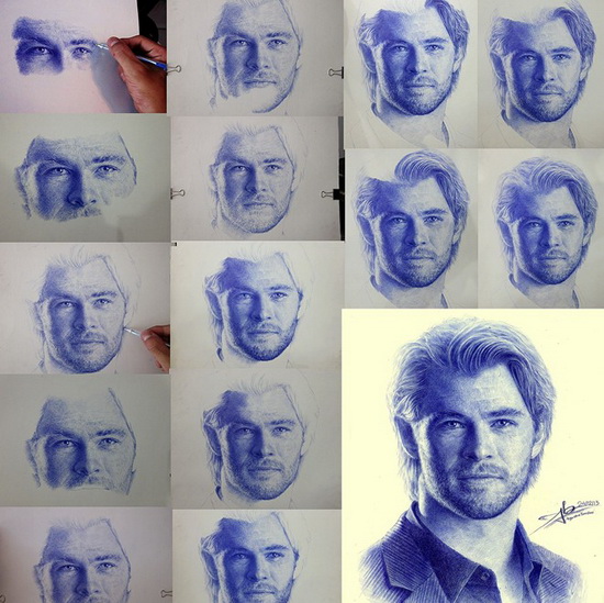 Vẽ bút bi đòi hỏi tỉ mẩn và cẩn trọng. Chàng trai này chia sẻ: "Đôi khi đang vẽ thì ngòi bút rỉ mực, mình phải lau khô kẻo sẽ hỏng bức tranh". Hình ảnh này ghi lại quá trình hoàn thiện bức vẽ diễn viên nổi tiếng Chris Hemsworth.