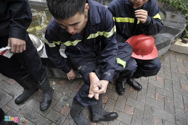 Dù đã đi ủng bảo hộ, chiến sĩ PCCC này vẫn bị mảnh kính từ hiện trường găm vào chân trong lúc cứu hộ.