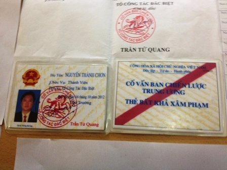 Cụ thể, Nguyễn Thành Chơn đã sử dụng giấy giới thiệu, thẻ thành viên có ghi là “cố vấn chiến lược trung ương – thẻ bất khả xâm phạm”.