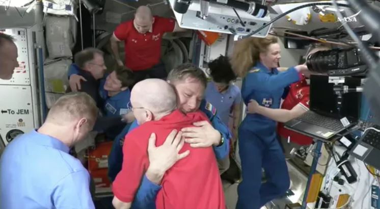 Phi hành gia Don Pettit ôm nhà du hánh Kirill Peskov, sau khi tàu vũ trụ SpaceX cập bến ISS