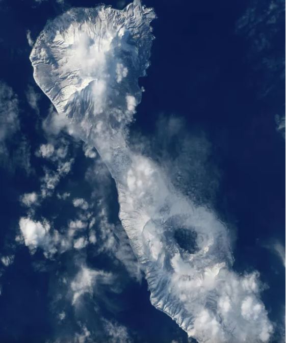 Cảnh quan núi lửa Zavaritsky, hồ Biryuzovoe và núi Milna trên đảo Simushir thuộc quần đảo Kuril Lớn. © Ảnh : Alexander Gorbunov / Roscosmos
