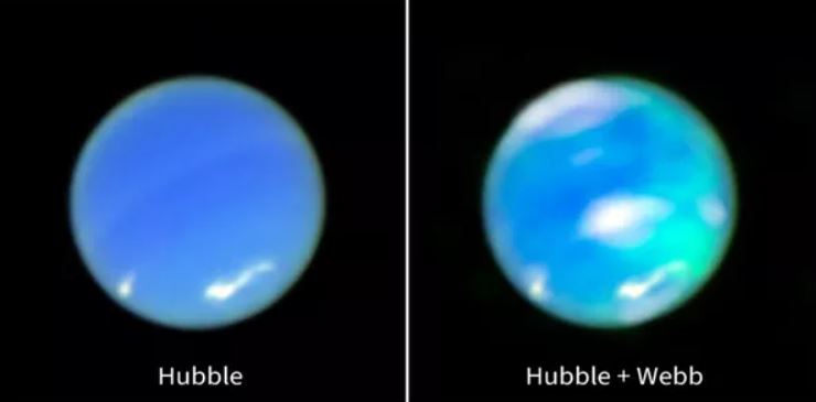 Bên trái - hình ảnh Sao Hải Vương từ Kính viễn vọng Không gian Hubble, bên phải - hình ảnh kết hợp từ Hubble và Webb, cho thấy cực quang dưới dạng các đốm màu xanh lam nhạt
